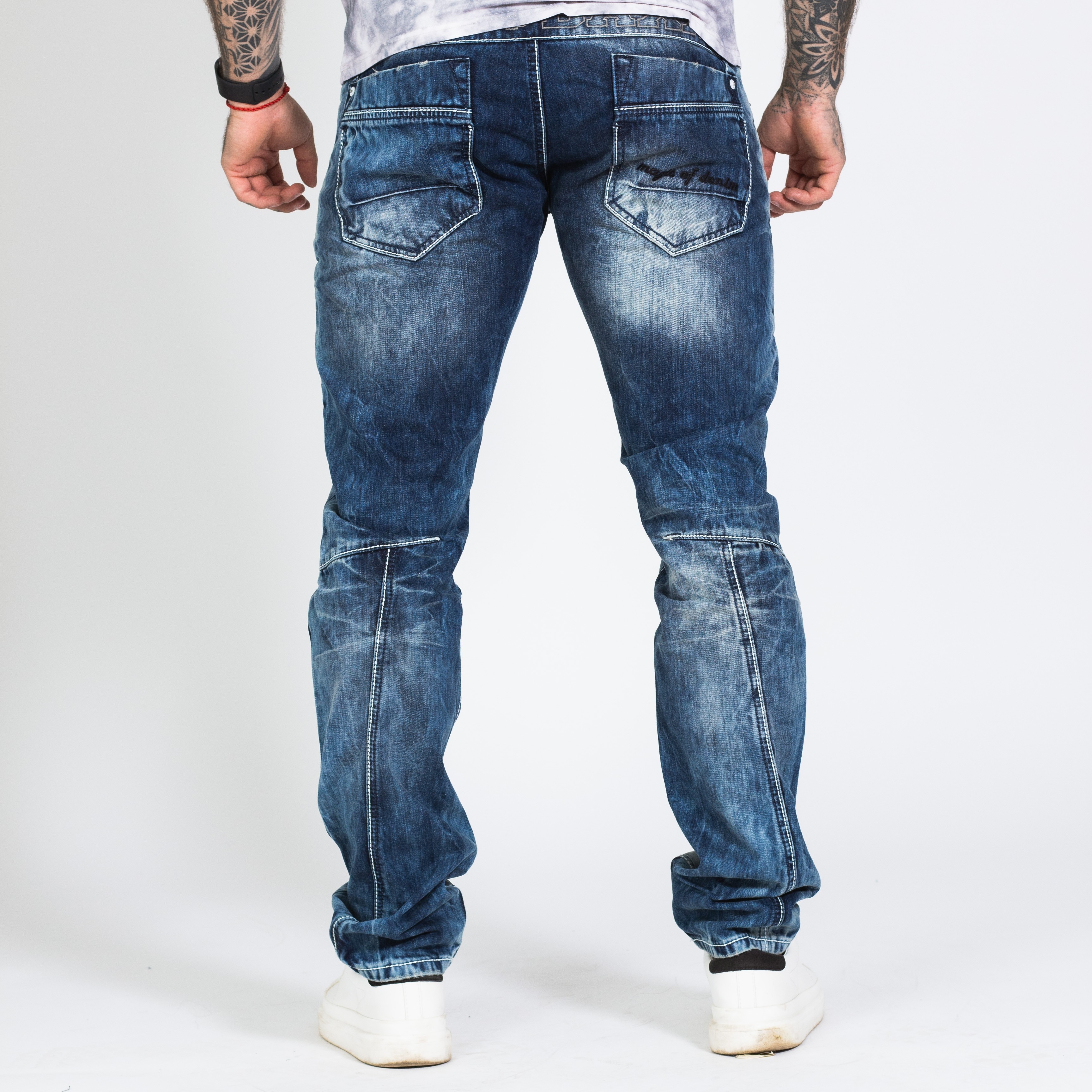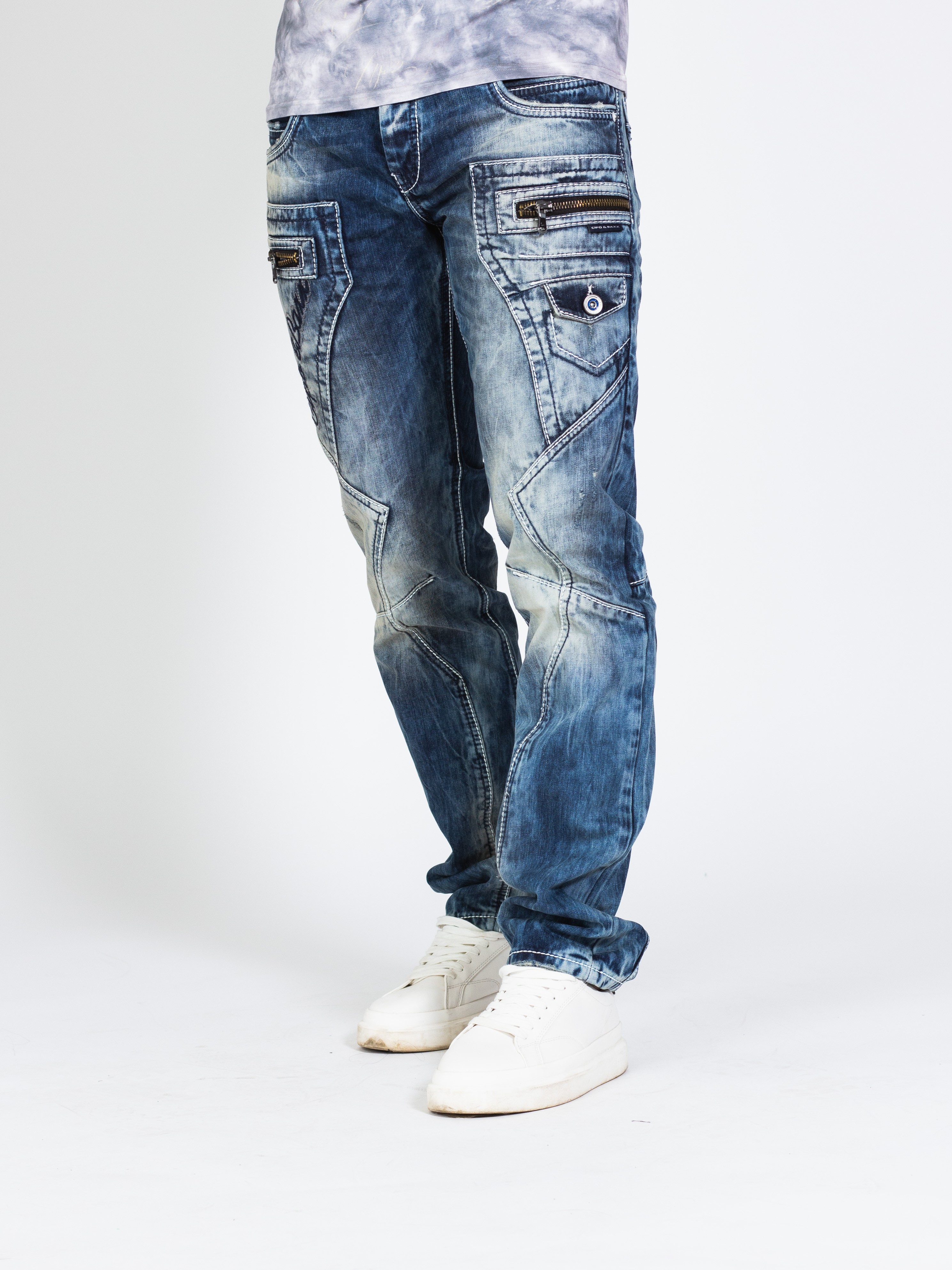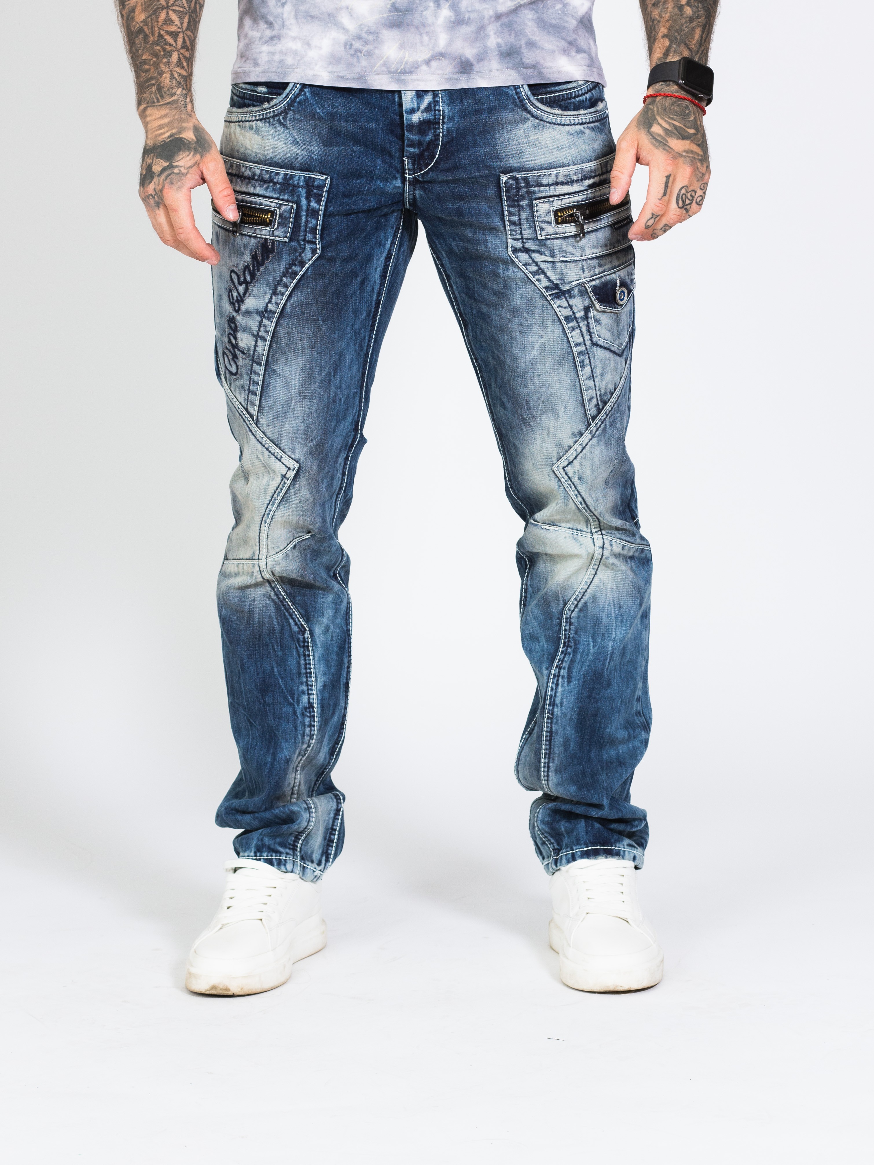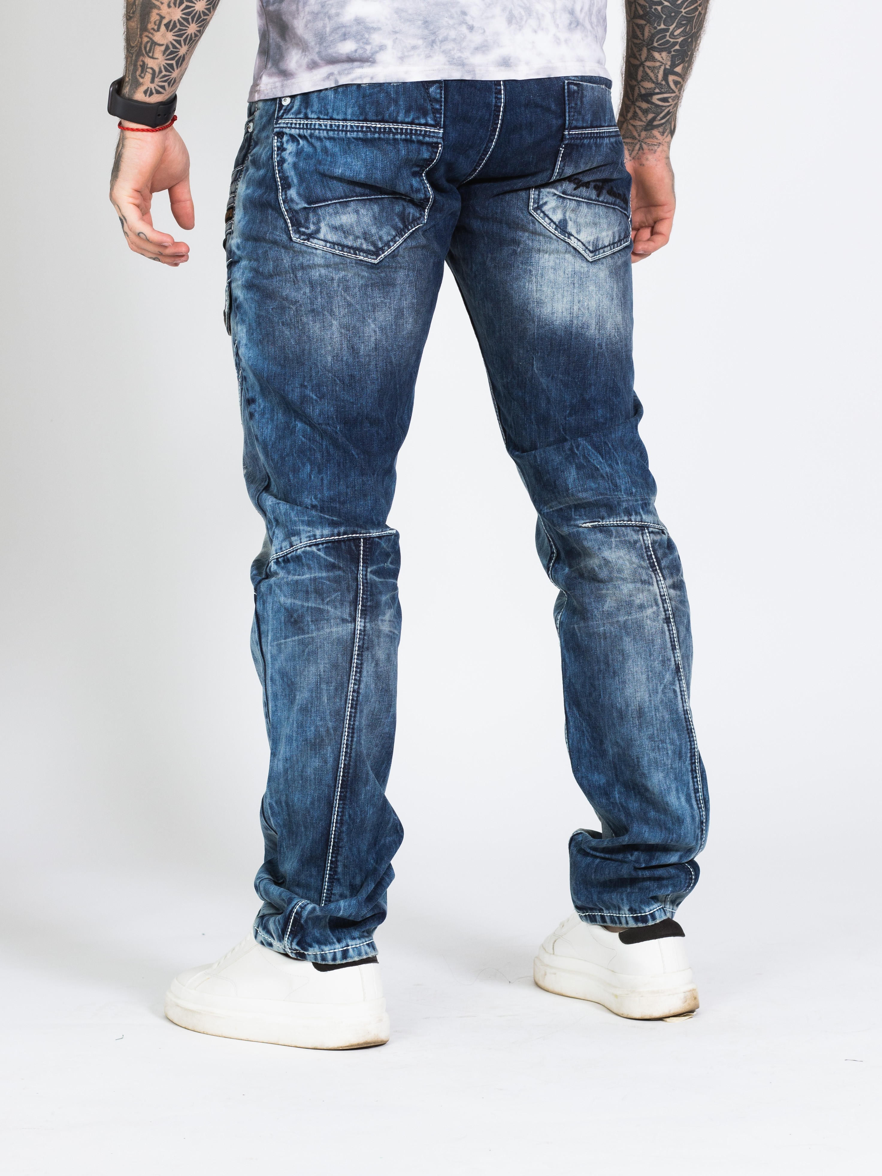 Pánské rifle CIPO & BAXX s výrazným prošíváním a nápisem CIPO & BAXX na pravé straně u váčku