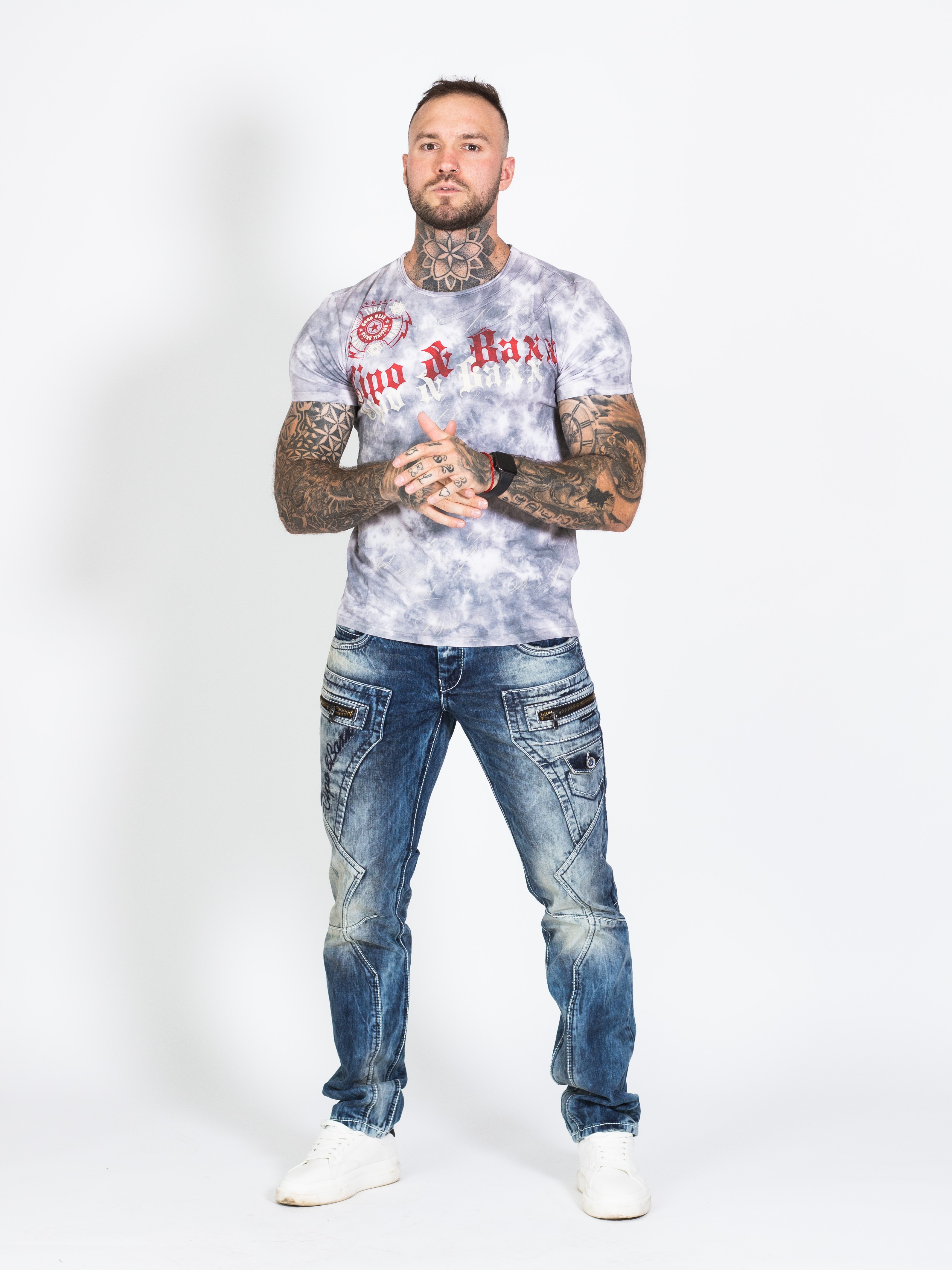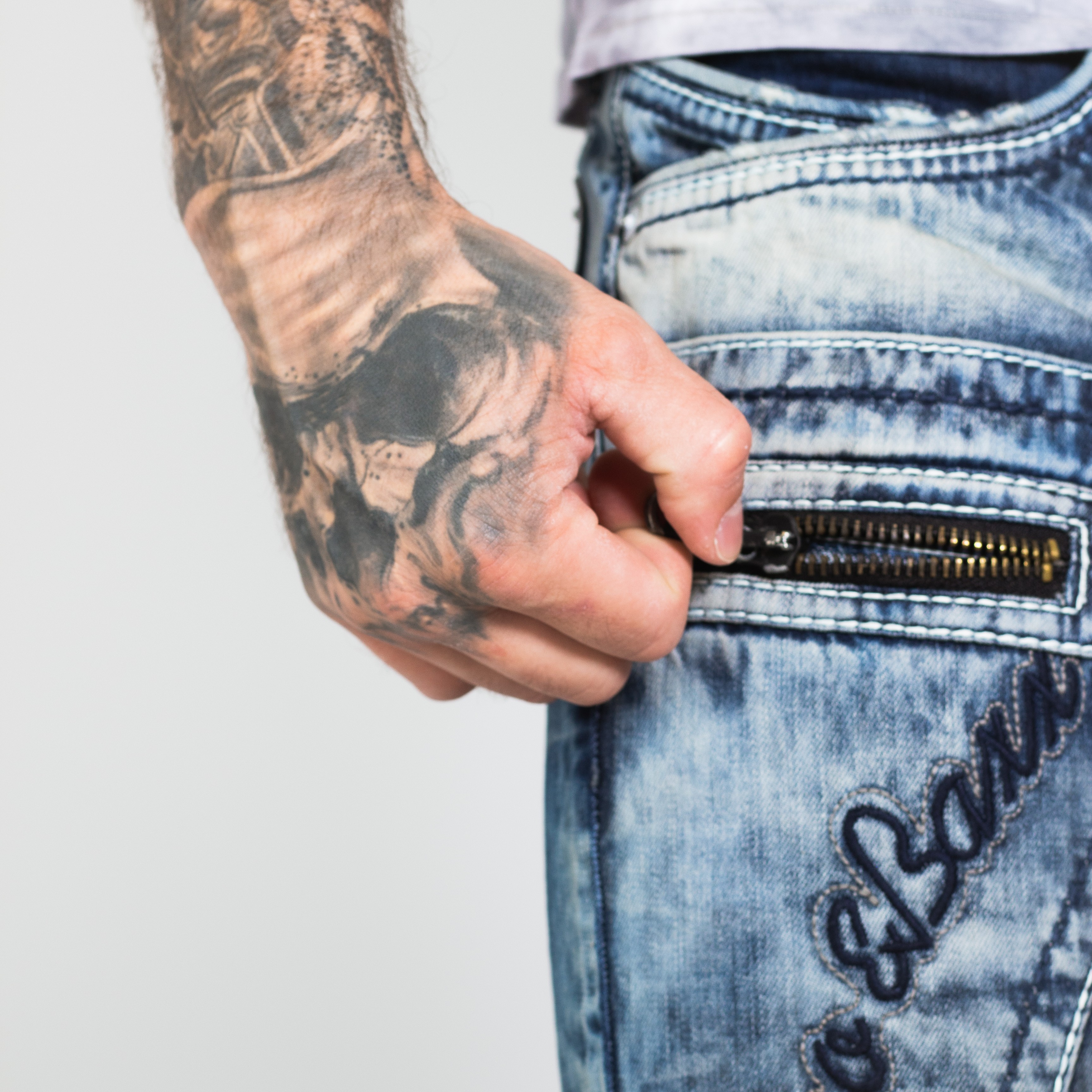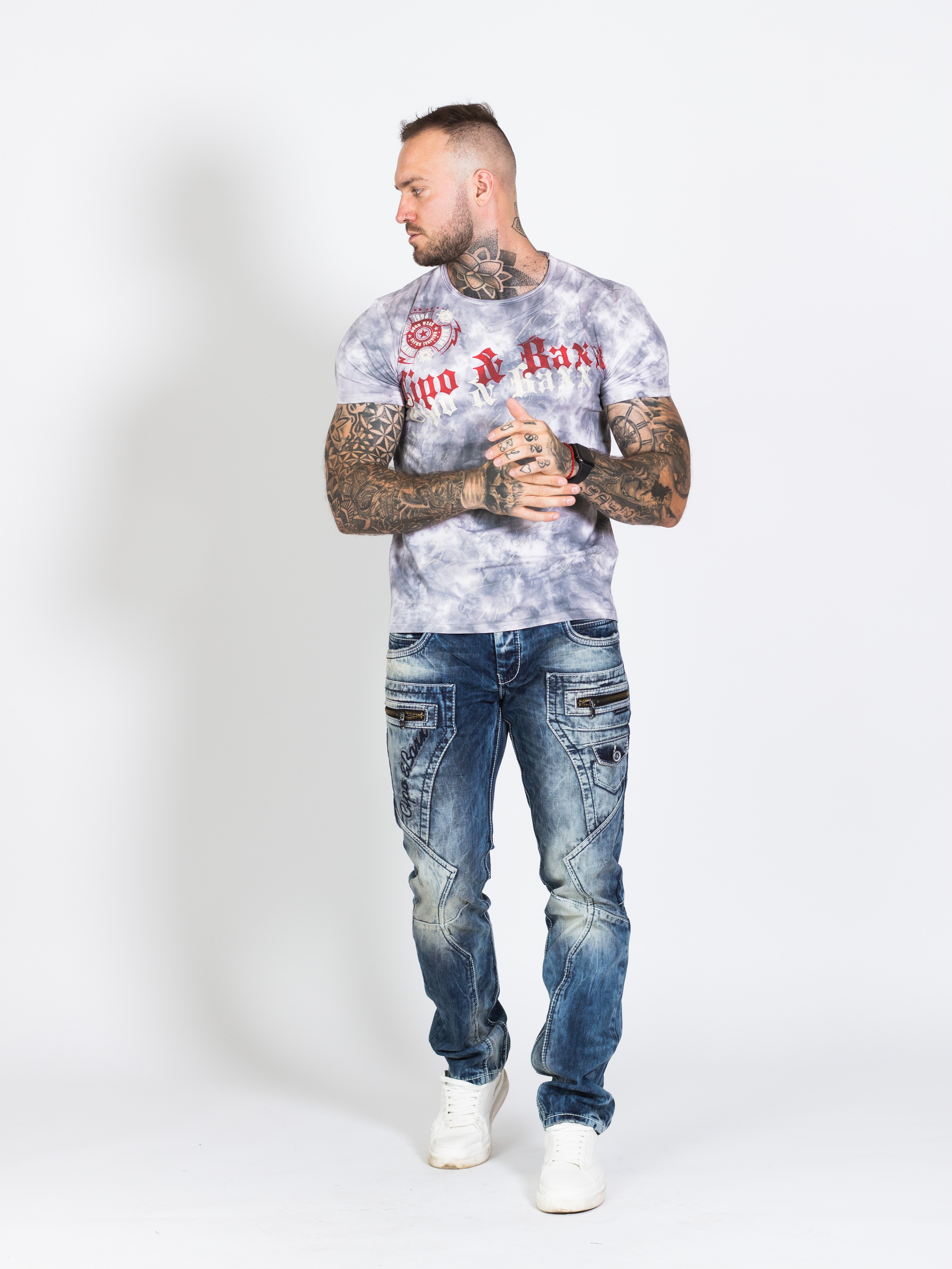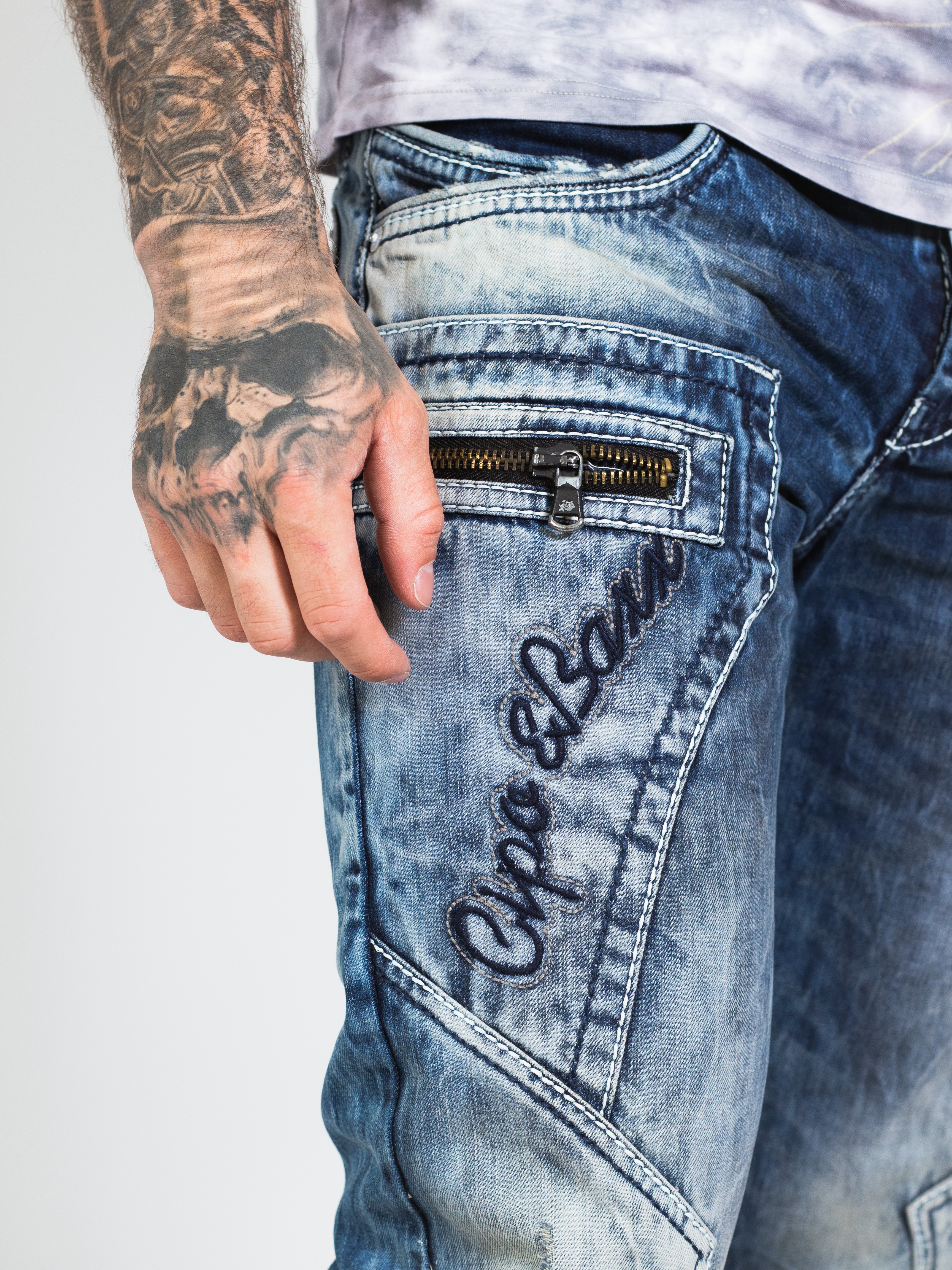 Pánské rifle CIPO & BAXX s výrazným prošíváním a nápisem CIPO & BAXX na pravé straně u váčku